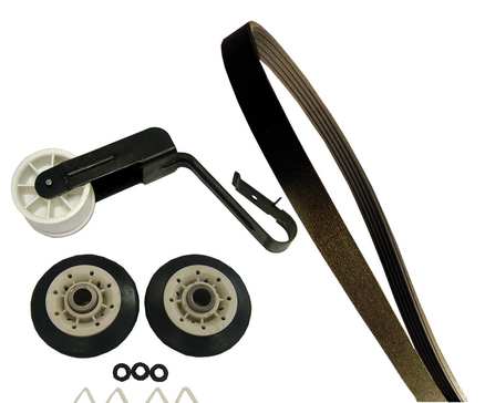 Repair kit for Whirlpool®, Kenmore®, & Roper® dryer; rollers, belt and idler pulley, for 29" wide Dryers built 1965 and later. This dryer maintenance kit contains all of the parts that are commonly defective when the dryer is noisy.