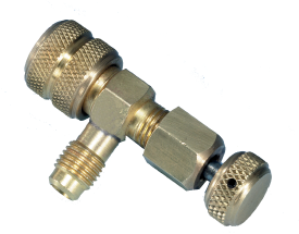 Hose gas retainer and core depressor attaches to charging hose, then coupled to fitting.