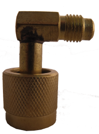 Quick coupler valve depressor with retaining ring, used to make connection between equipment with unlike threads without losing gas. 90° angle with 1/4" female flare & 1/4" male flare.