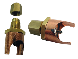 Widely used and easily installed on a charged line. After brazing the saddle portion onto line, the steel pin with valve core penetrates the line, and locks into place.