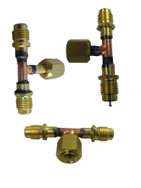 - ¼" male flare with valve core x ¼" male flare x ¼" female flare nut with depressor tip on the branch