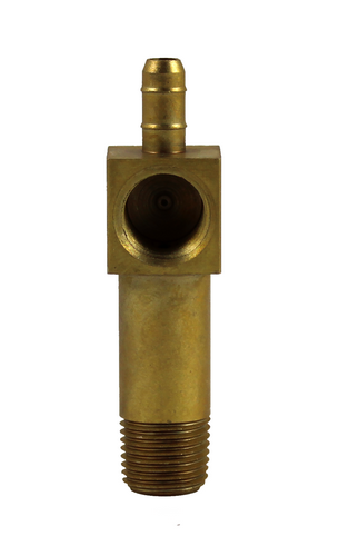 Compact, brass, one piece gauge tee with 1 / 4" barb to 1 / 8" MPT.