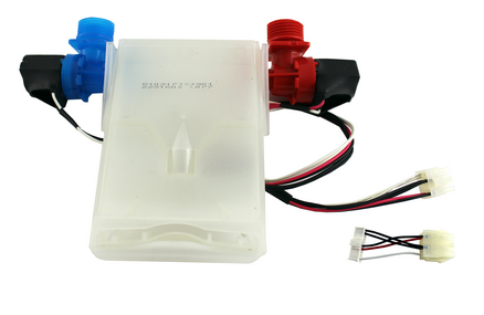 This water inlet valve attaches the water lines to the back of your appliance. The attaching solenoids on the valve open and close according to the desired temperature, or amount of water needed.